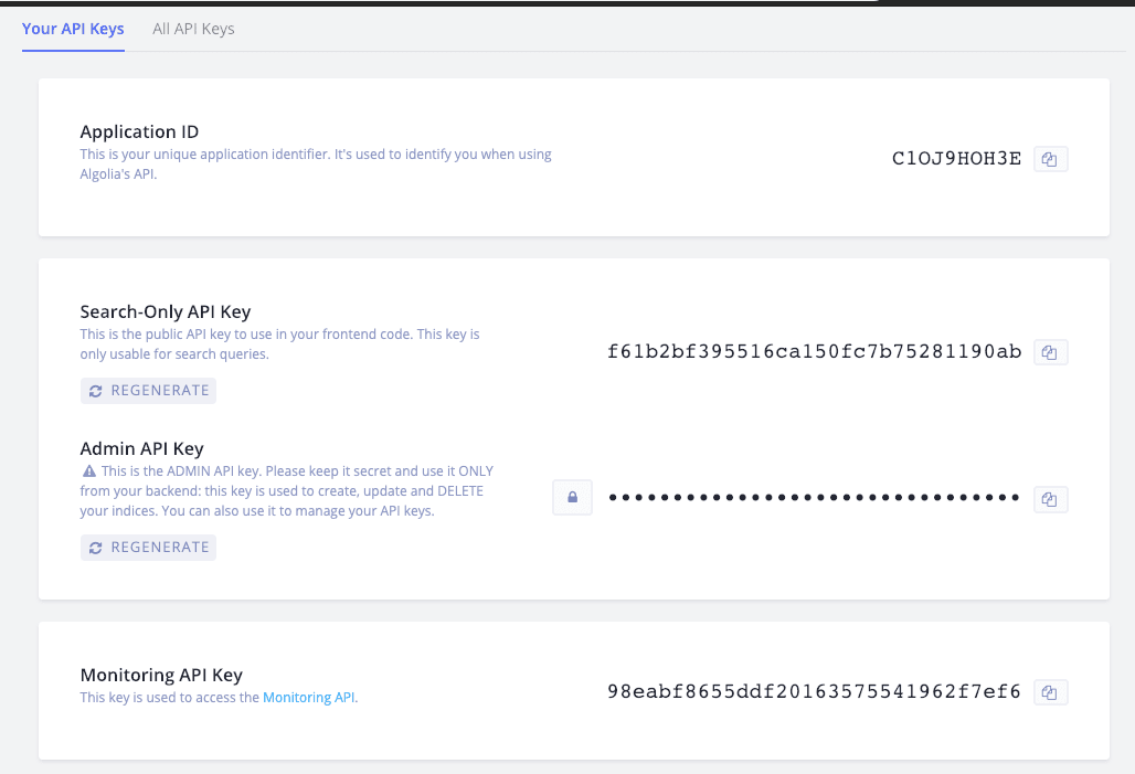 In your site/config.toml file you will see params.algolia. These are used just for the search bar to make the search happen…do not use your Admin API KEY!!